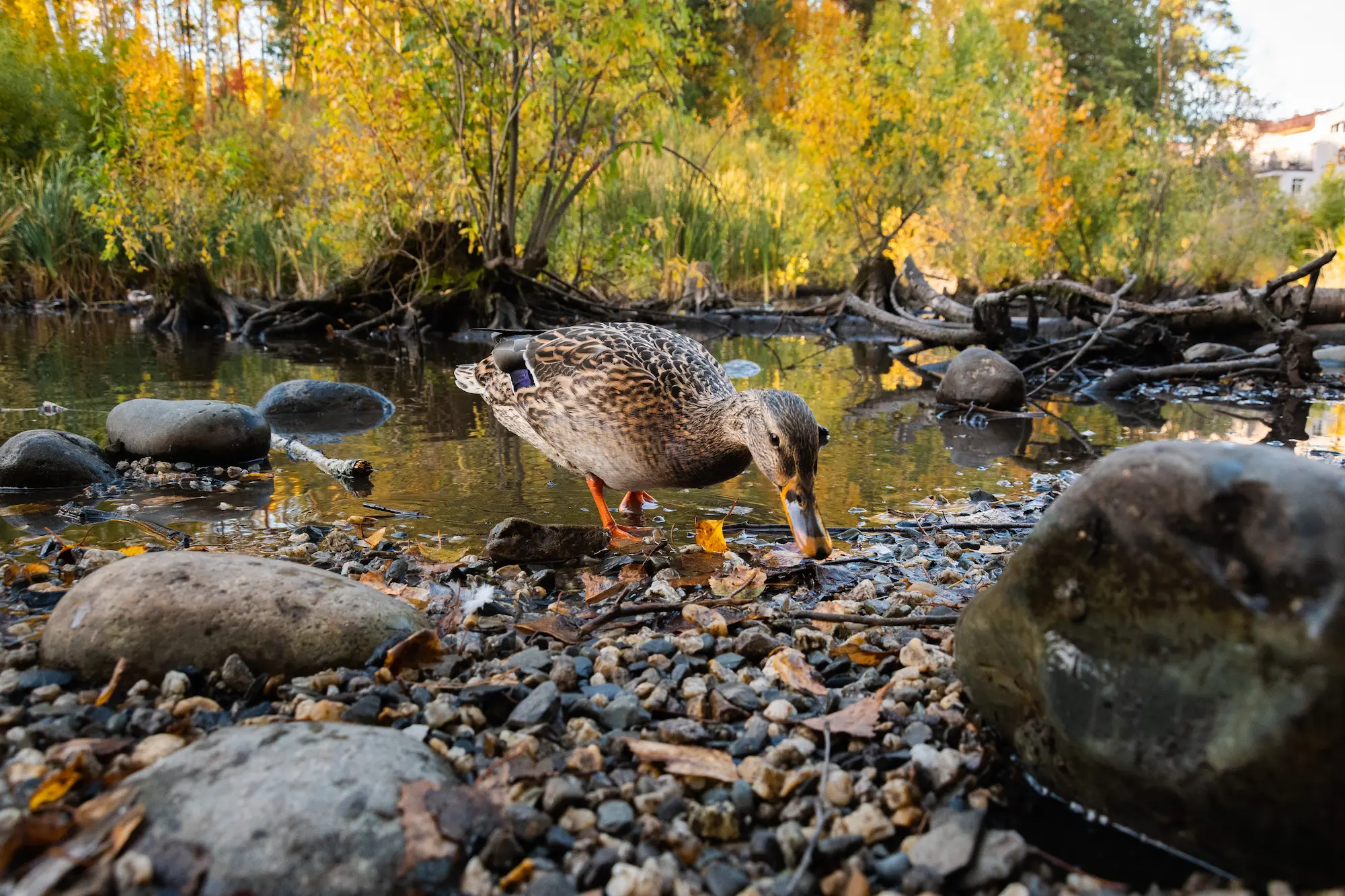 Возвращайтесь на Морской проспект и не пропустите поворот на улицу Золотодолинскую. В мае там расцветают яблони. Местные активисты очистили болото на Золотодолинской и сколотили вокруг него деревянные дорожки и мосты. Теперь это пруд с утками — точка притяжения туристов и медитативное место для студентов во время летней сессии.
