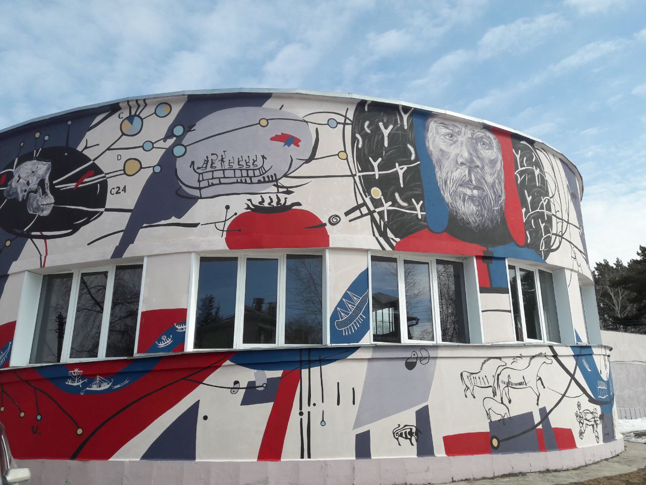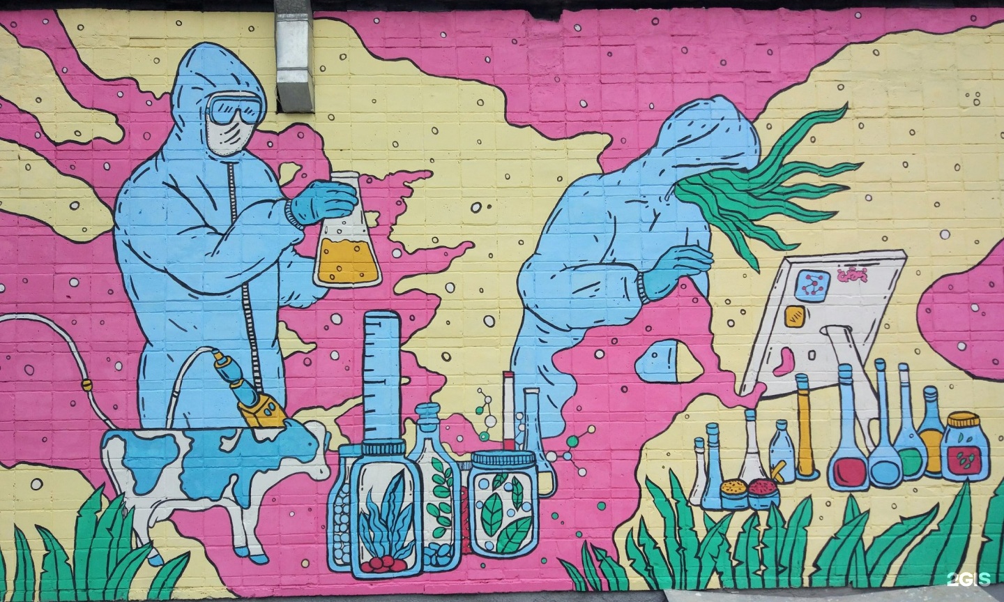 Если пройти мимо Золотодолинской, в конце Морского проспекта есть поворот на тихую улицу Терешковой, ведущую к НГУ. По дороге найдите следы фестиваля стрит-арта «Графит науки». В 2017–2020 годах художники со всей России украшали Академгородок стрит-артом, посвященным последним научным открытиям. На трансформаторных будках и общежитиях появились грффити с биоинженерами и одомашненными лисами. А муралы «Продам гараж» и «Палеогенетика» на улице Терешковой нарисовали организаторки фестиваля, художницы Зося Леутина и Янина Болдырева (масштабная роспись во дворике бывшего Облпотребсобза на площади Ленина — тоже работа Янины).